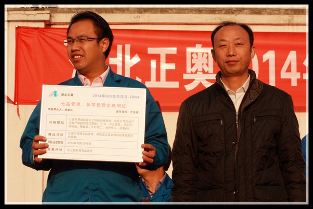 到會(huì)領(lǐng)導(dǎo)為G29項(xiàng)目組成員頒發(fā)了戰(zhàn)表,為下一階段的改善制定新的挑戰(zhàn)目標(biāo),全體員工見(jiàn)證了這一重要時(shí)刻,并在會(huì)議現(xiàn)場(chǎng)用熱烈的掌聲表達(dá)了完成任務(wù)的信心和決心。