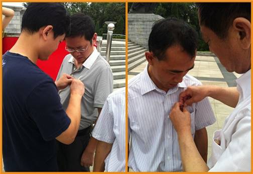 進(jìn)入陵園后,在公司黨支部書(shū)記萬(wàn)全進(jìn)的帶領(lǐng)下,恒通公司全體黨員在革命烈士紀(jì)念碑前重溫入黨誓詞,隨后舉行了對(duì)預(yù)備黨員鄧輝轉(zhuǎn)正,同時(shí)吸收余招輝、黃東明為預(yù)備黨員的宣誓儀式,由萬(wàn)全進(jìn)書(shū)記和劉清元副總經(jīng)理分別為兩位預(yù)備黨員佩戴黨徽。